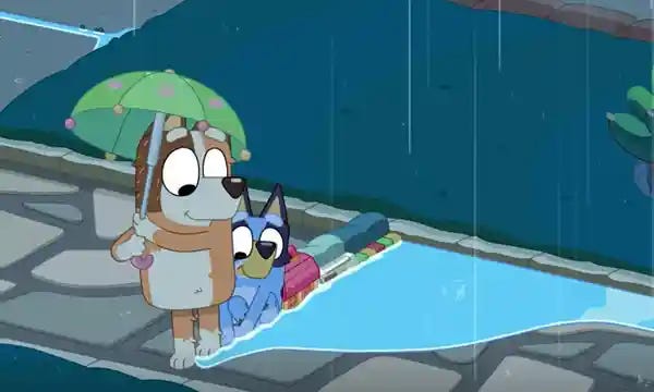 Rain brings us an episode of Bluey that’s a little different than the rest: there are but 9 spoken words. And none of them are about rain.