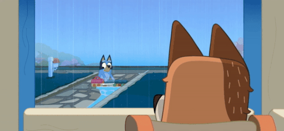 As for Bluey, and the novelty before her, the sense of urgency is much different. It’s not about saving the work, the urgency is about the rain itself.